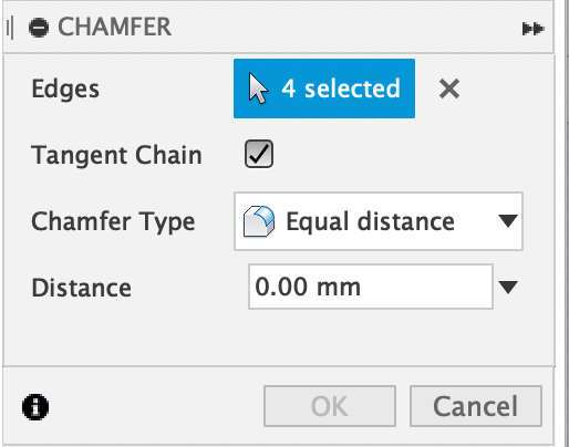Let’s say you select the wrong things you want to chamfer, instead of hitting cancel or escape, just hit that little x, and it will wipe what you’ve selected and let you reselect what you want! If you want to get real fancy, you can hold down command (on a mac) or ctrl (on a PC) and manually deselect the individual parts that you didn’t want in the operation!